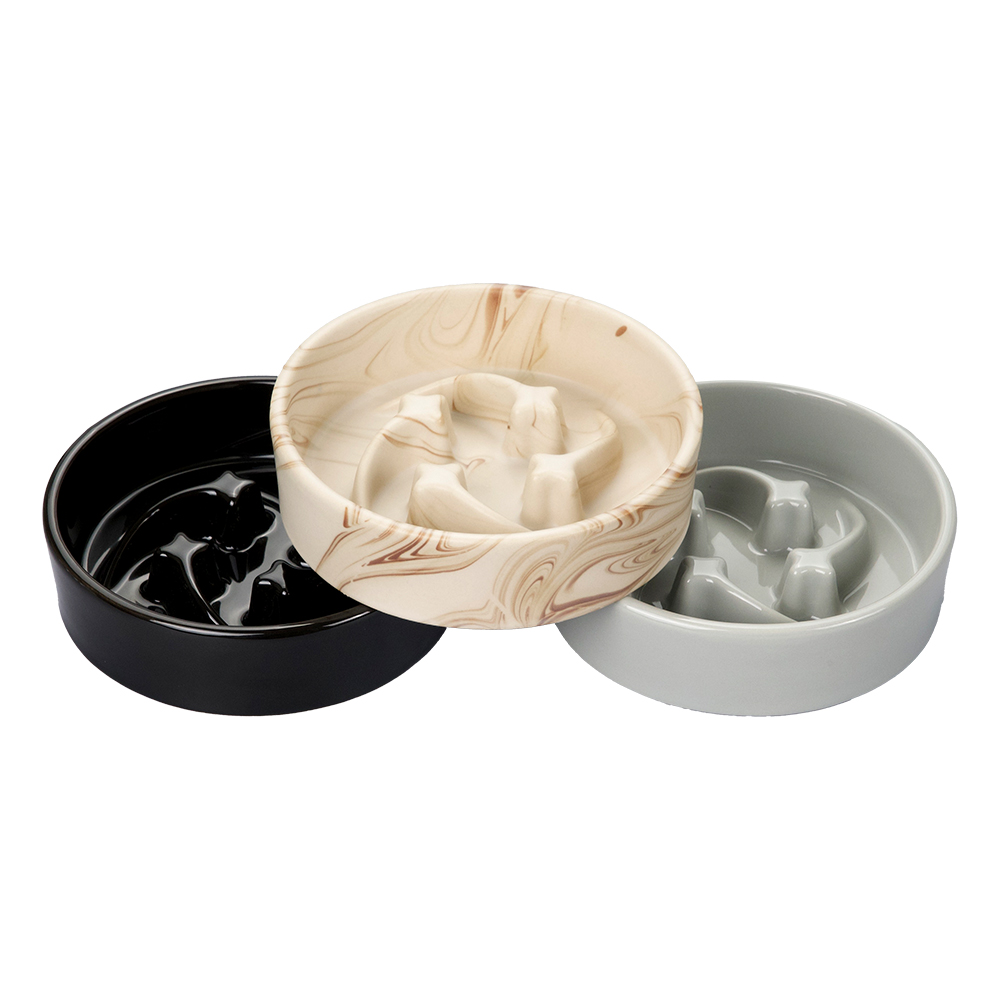 A highly functional slow-feeding dog bowl designed to slow your pet’s eating pace with its textured pattern, effectively reducing choking and vomiting while helping prevent bloat. Unlike lightweight plastic bowls, the sturdy New Bone China construction ensures this bowl is heavy enough to resist being pushed across the floor. With a medium capacity, the concave side is ideal for kibble or liquids, while the raised side works perfectly for small treats. Microwave and dishwasher safe for everyday convenience.