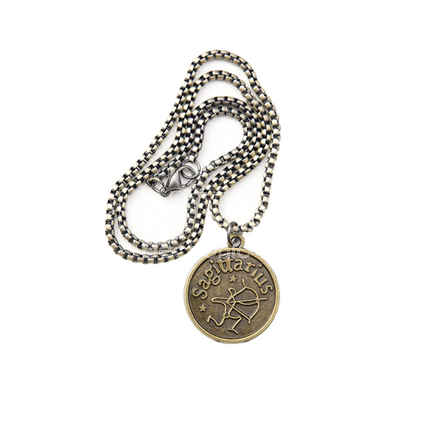 These custom zodiac sign necklaces feature a retro zinc alloy coin pendant, one side of which is embossed with the name and symbol of a zodiac sign while the other side includes an aluminum insert on which you can imprint your favorite photo or text.