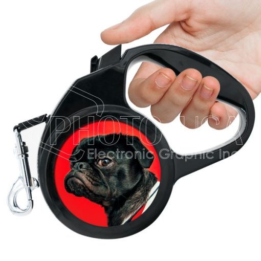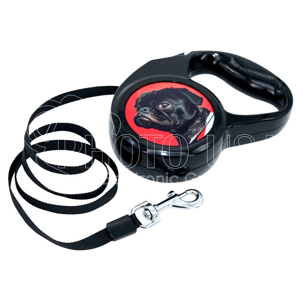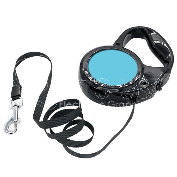 The dog leash has a handle composed of a black plastic case and an ergonomic anti-slip grip that fits in your hand comfortably. On both sides of the handle lies a round printable area (Φ 2.6 inch) for customized sublimation image, which makes the dog leash stand out from others. The leash made of nylon strap is strong and durable and extends up to 9.8 ft. (3 m), and at the end of the leash is a metal clasp that connects to the dog’s collar.