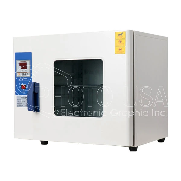 This product is equipped with a heating tube behind the working room, and the back is provided with a blowing device. The intelligent temperature control system controls the temperature constant while the air circulation system ensures uniform temperature in the working room. The shell of this oven is made of high quality cold-rolled steel plate with environmental protection electrostatic spray treatment, and the inner chamber is made of zinc-plated steel sheet. Also, there is a large observation window in the door which is made of double-layer tempered glass.